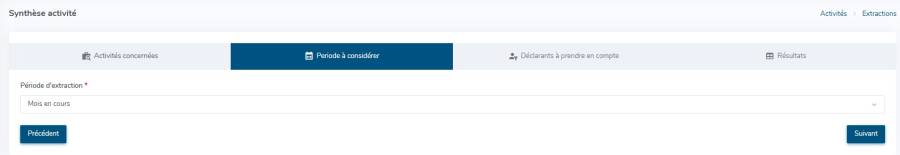 Choisissez la période d'extraction entre mois en cours, mois précédent, année en cours, année précédente et personnalisée puis cliquez sur Suivant :