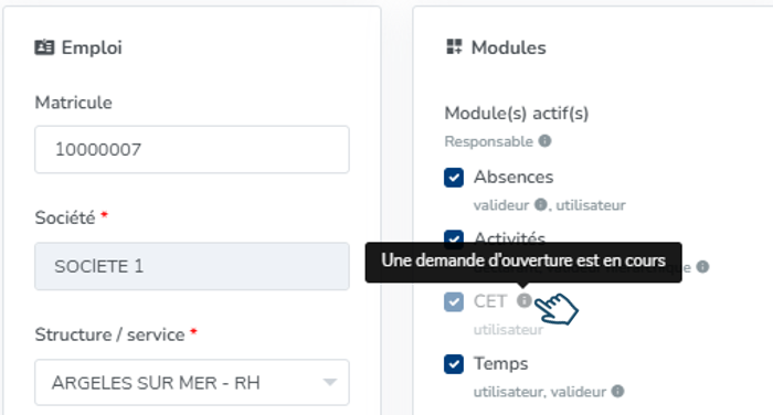Tant que l'action d'approbation ou de refus ne sera pas intervenue sur cette demande d'ouverture, l'application empêche toute autre action sur le module CET pour cet utilisateur.