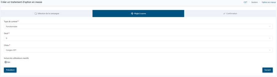 Seuls les critères renseignés sur l’écran d’option en masse sont contrôlés. Les éléments faisant l’objet d’un contrôle sont le type de contrat et le solde CET.