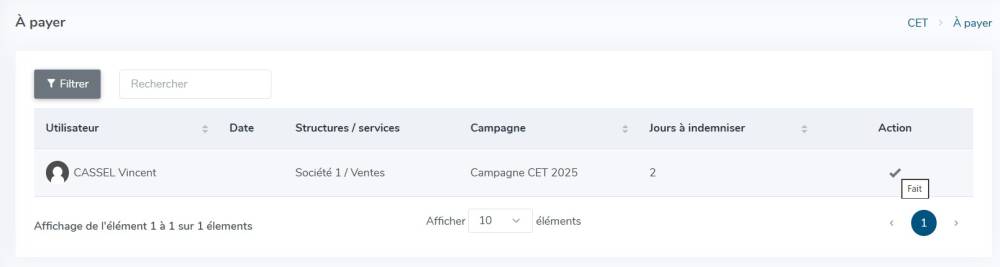 Après intégration de la demande dans votre logiciel de paie, cliquez sur « Fait » dans la colonne « Action ».