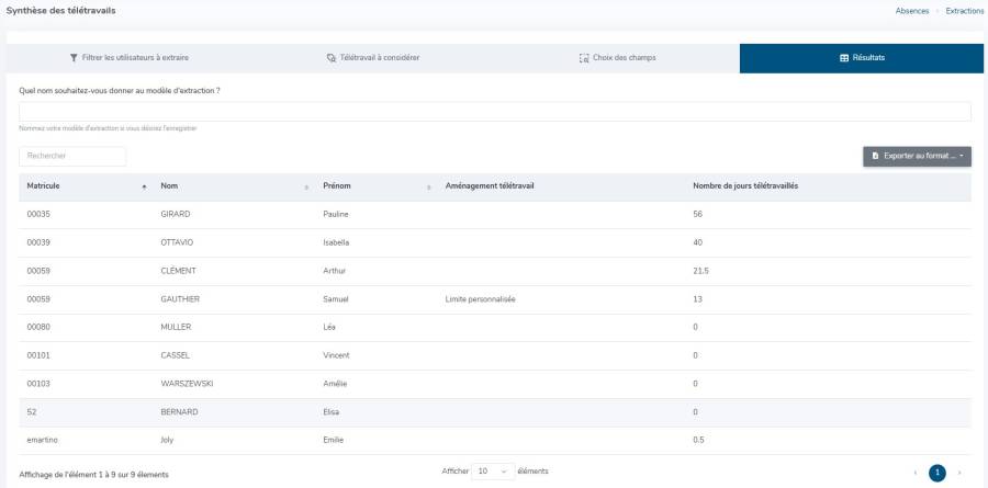 L'extraction permet de générer un récapitulatif des modalités de télétravail de vos utilisateurs sur une période donnée (types d'aménagements et nombre de jours télétravaillés).