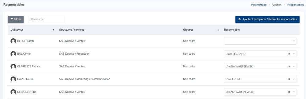 Cet écran affiche l'ensemble des utilisateurs et leurs responsables, quand ils leur sont attribués.