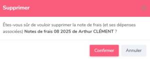 Cliquez sur la corbeille figurant dans la synthèse, un message de confirmation s’affiche à l’écran afin de vérifier que vous souhaitez bien supprimer la note de frais ainsi que l’ensemble des dépenses qui y sont associées.