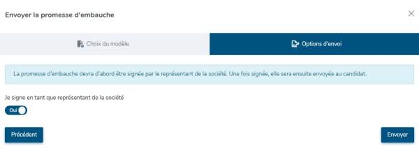 Pour envoyer une promesse d'embauche avec signature électronique, je clique sur le bouton dédié Faire signer la promesse d'embauche .