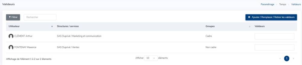 Cet écran affiche l'ensemble des utilisateurs et leurs valideurs, quand ils leur sont attribués.