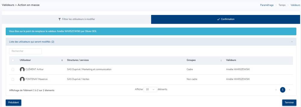Un message vous alerte que vous êtes sur le point de remplacer le valideur aux utilisateurs présents dans la liste ci-dessous.