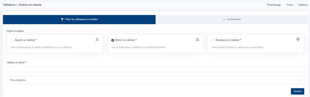 - Nouveau valideur : Saisissez au minimum deux caractères du nom, puis choisissez dans la liste proposée la personne qui deviendra le nouveau valideur.