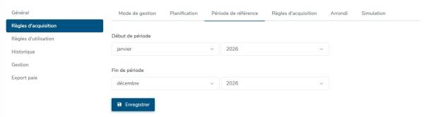 - Période de référence : Définit la période de calcul des droits au regard de la présence de l'utilisateur. Par exemple, pour un type d'absence RTT, la période de référence va de Janvier à Décembre.