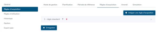 - Règles d'acquisition : L'écran affiche un tableau où seront listées les règles paramétrées. Cliquez sur Intégrer une règle d'acquisition pour sélectionner celle qui correspond à votre besoin. Vous pouvez également affiner la population concernée par cette règle en fonction du groupe, du type de contrat et/ou de la société en cliquant sur l'icône d'entonnoir.