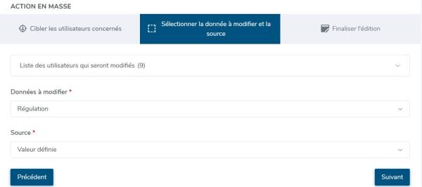 - Contrôlez la liste des utilisateurs qui seront impactés par votre action puis sélectionnez ensuite la donnée à modifier : Crédit, régulation ou l'état du compteur.