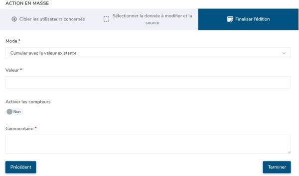 - Enfin, finalisez l'édition de l'action en masse en compléter les champs avant de cliquer sur Terminer :