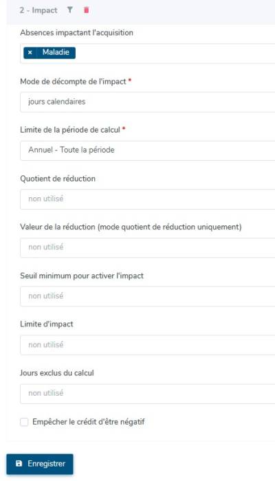 ⇒ La règle d'impact s'active et l'utilisateur aura un impact de deux jours sur ses congés car 20 jours d'absence.
